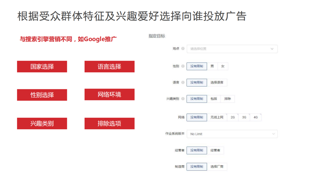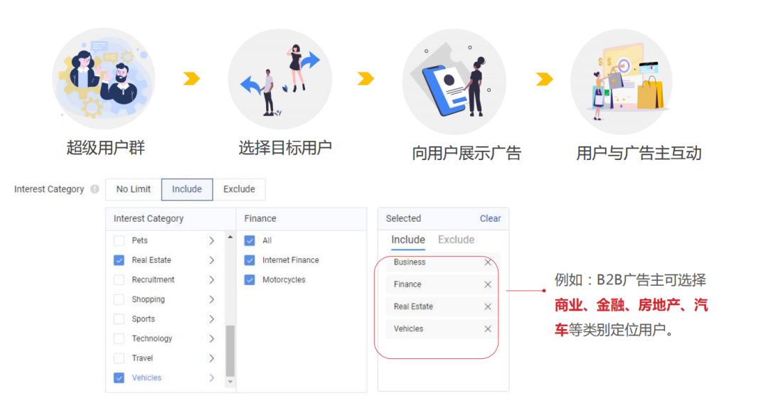 兴趣定向:可以先为客户做目标用户画像。例:男性一般会看金融、商业、房地产、汽车等