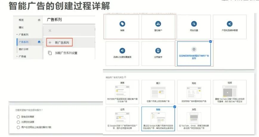 智能广告系列可以在Google搜索网络和Google展示广告网络中投放。搜索网络可以针对已经在搜索特定商品或服务的用户展开宣传,而展示广告网络则可以帮助您在购买周期的更早阶段吸引用户注意。也就是说,您可以在用户开始搜索您的产品或服务之前向他们展示广告;
